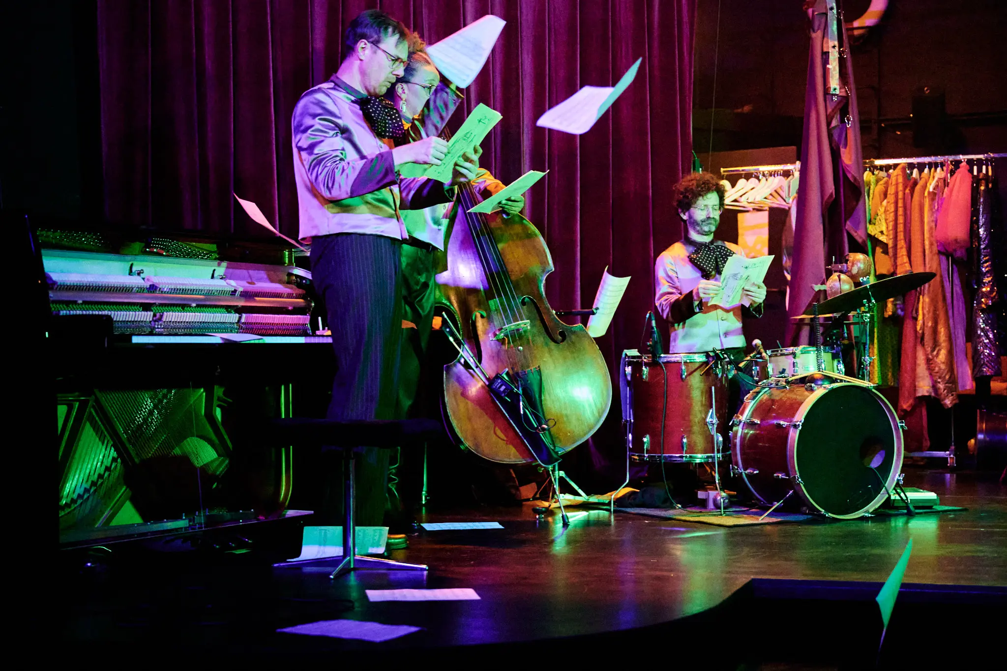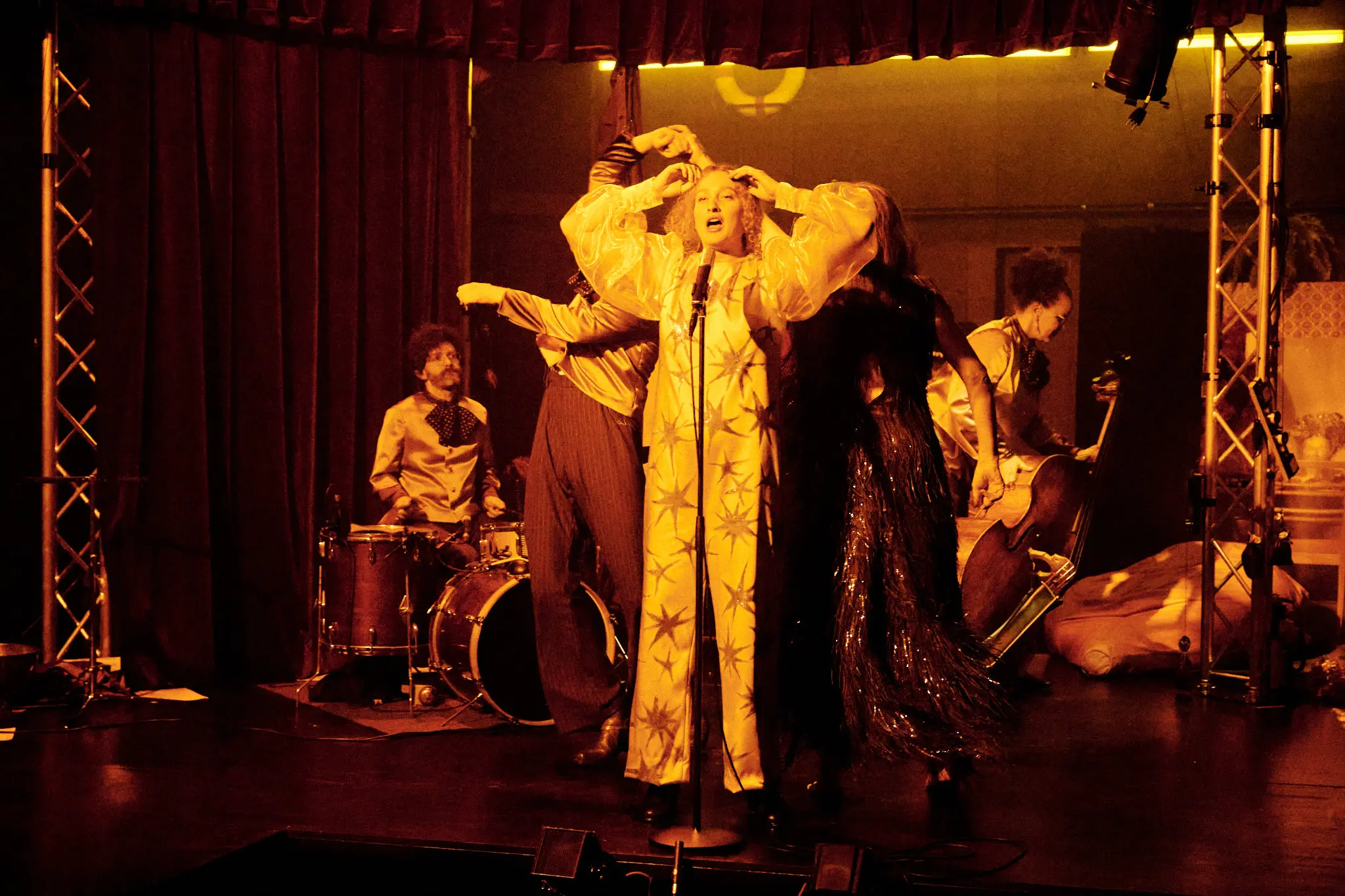 Ce qui nous rassemble. Camille Rebetez, Rebecca Vaissermann, Daniel Vuataz et Fanny Wobmann ont écrit un texte à huit mains, une véritable partition de mots dont s’est ensuite emparé Antoine Courvoisier. Sous leurs plumes apparaissent les contours d’un cabaret, avec ses artistes et leurs personnalités colorées, ancré dans un futur proche dans lequel le monde que nous connaissons a disparu. Exit l’électricité illimitée et la connexion internet instantanée, envolée la profusion constante de nos sociétés, finie la nature verdoyante. L’environnement extérieur de cet avenir inquiétant est gris, enfoui sous les cendres d’un temps révolu. Dans cet espace scénique aux allures de refuge se déploie alors un petit monde clos bousculé par l’urgence, et les numéros s’y enchaînent dans un foisonnement vertigineux de chansons et de danses.